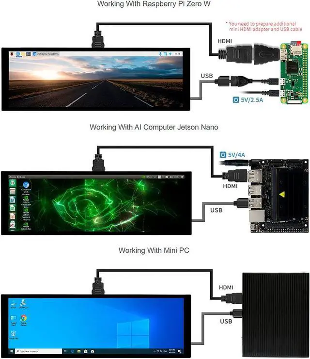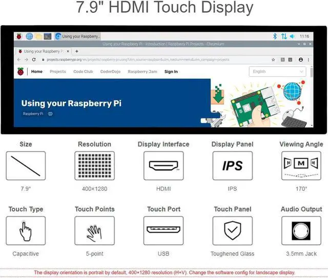 7.9inch IPS screen, 400x1280 resolution, HDMI/USB interfaces.Toughened glass capacitive touch panel.HDMI audio input, 3.5mm headphone/speaker jack.