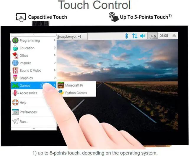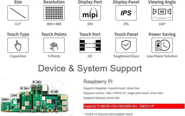Supports Raspbian, 5-points touch, driver free. Supports Ubuntu / Kali / WIN10 IoT, single point touch, driver free. Supports Retropie, driver free.
