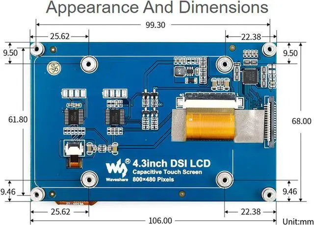 • 4.3inch DSI IPS screen. 800x480 hardware resolution