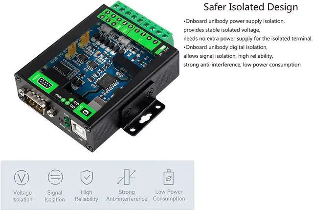 Safer Isolated Design--- Onboard unibody power supply isolation, provides stable isolated voltage, needs no extra power supply for the isolated terminal. Onboard unibody digital isolation, allows signal isolation, high reliability, strong anti-interference, low power consumption.