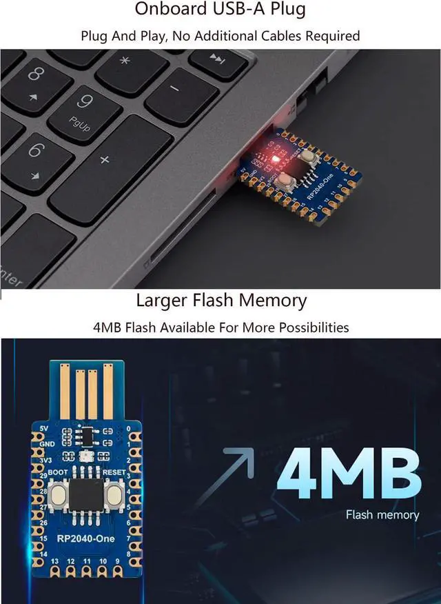 Dual-core Arm processor RP2040-One, a Pico-like MCU board based on Raspberry Pi RP2040, Castellated Module, Suitable For SMD Applications. Dual-core Arm Cortex M0+ processor, flexible clock running up to 133 MHz