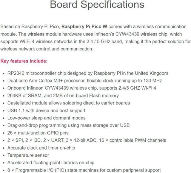 Raspberry Pi Pico W comes with a wireless communication module. The wireless module hardware uses Infineon's CYW43439 wireless chip, which supports Wi-Fi 4 wireless networks in the 2.4 / 5 GHz band, making it the perfect solution for wireless network control and communication.