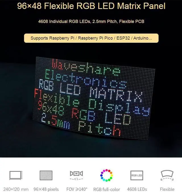 96×48 flexible RGB LED matrix panel, 2.5mm pitch, flexible PCB. 4608 individual RGB LEDs, full-color display, adjustable brightness and bendable PCB.