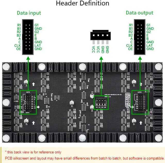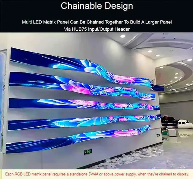 Chainable design--- multi LED matrix panel can be chained together to build a larger panel via HUB75 input/output header. Onboard two HUB75 header, one for controller data input, one for output, chain support.