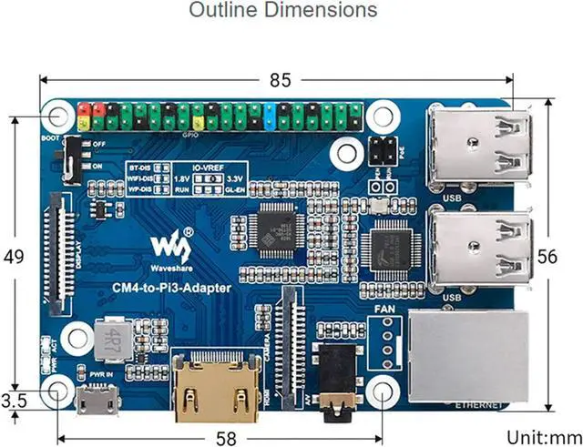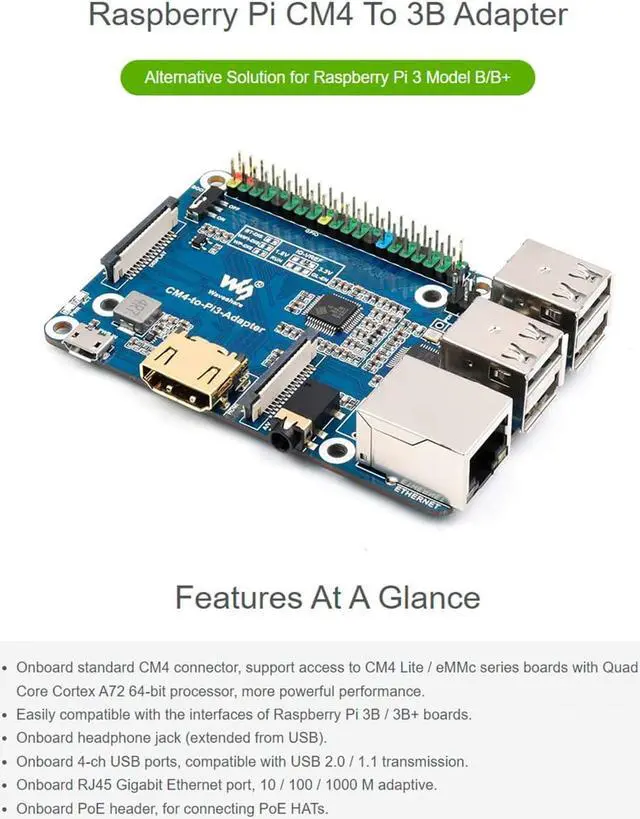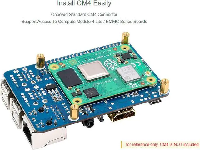 Onboard standard Compute Module 4 connector, support access to Compute Module 4 Lite / eMMc series boards with Quad Core Cortex A72 64-bit processor, more powerful performance. Adding CM4 with this adapter board, can replace Raspberry Pi 3 Model B/B+.
