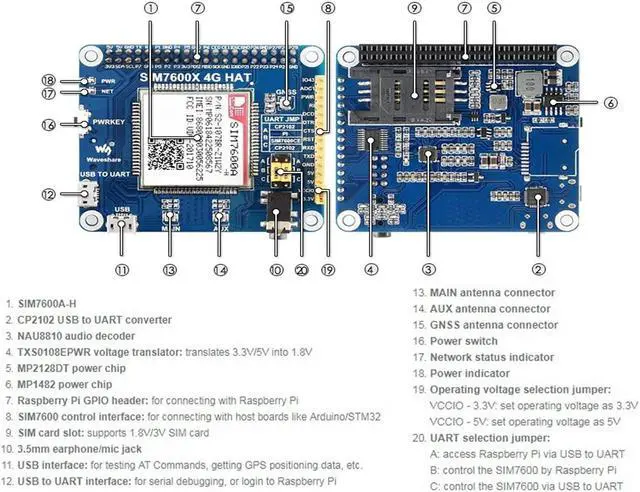 The SIM7600A-H 4G HAT (Based on SIM7600A-H) is a 4G communication and GNSS positioning module, Standard Raspberry Pi 40PIN GPIO extension header, supports Raspberry Pi series boards(compatible with Raspberry Pi Zero/Zero W/Zero WH/2B/3B/3B+/4B) and Jetson Nano. LTE-FDD B2/B4/B12 Brand,supports LTE CAT4 up to 150Mbps for downlink data transfer.This module is mainly applicable in North America (US,CA)