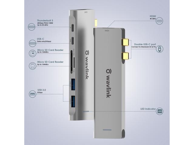 Wavlink USB C Hub, Type C Adapter Mini Docking Station with 4K HDMI Port, 2 USB 3.0, TF/SD Card Reader, USB-C PD3.0 100W and Thunderbolt 3, LED indicator For MacBook Pro for MacBook Pro/Air