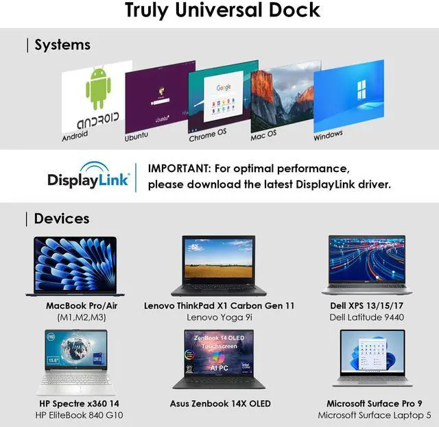 • Universal Laptop Compatibility: Designed for seamless integration with your gear. This universal docking station is fully compatible with Windows and macOS including all M-series MacBooks. We've included both a USB-C to C and a USB-A to C cable in the box, ensuring you can connect to virtually any modern laptop right away, regardless of its port type.