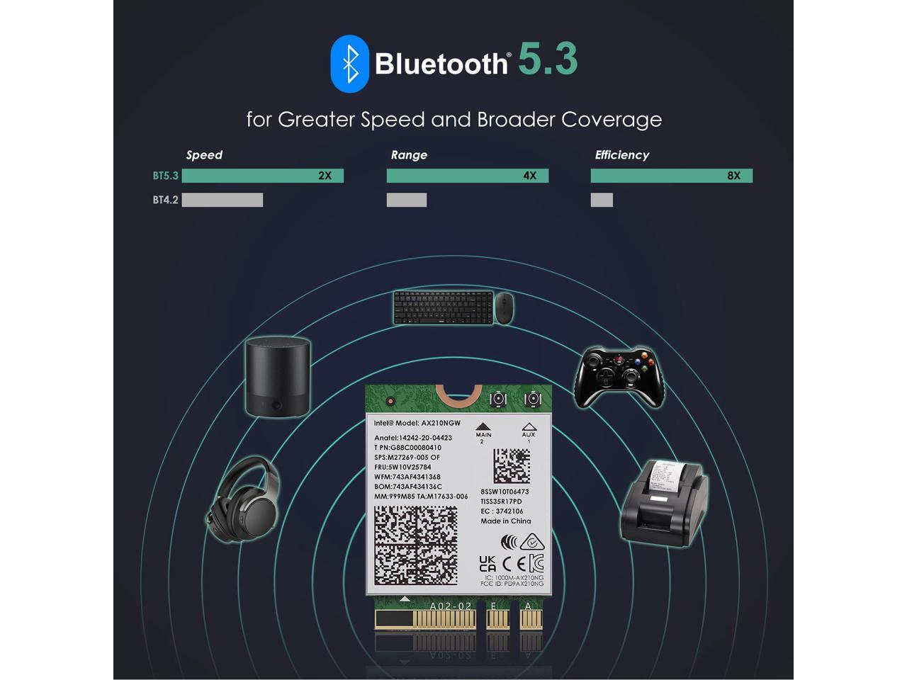 - Bluetooth 5.3 provides 4x range over Bluetooth 4.2, doubles the transmit speed for faster transmissions thereby reducing the overall power. Ideal for Bluetooth TWS(True Wireless Stereo) earbuds, headset, keyboard, mouse and others for more convenience and demands with this WiFi 6E module. Backwards compatible with BT5.1, 5.0, 4.2, 4.0, 3.0, 2.1.
