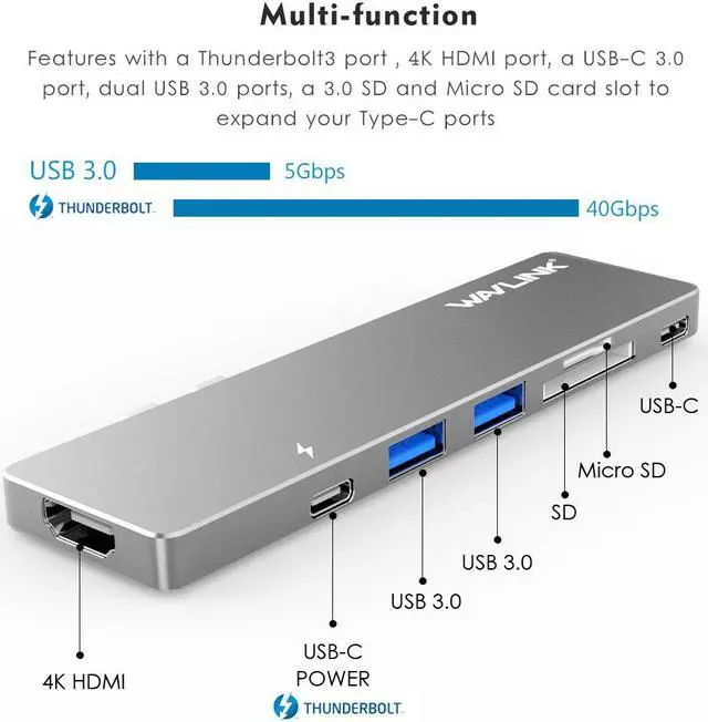 The Wavlink Aluminum USB-C Mini Dock is designed for 13inch and 15inch MacBook Pro from 2016 to 2020. Featured with a Thunderbolt 3 port, USB-C port, 2 USB 3.0 ports, 4k HDMI, and a SD/Micro card reader, the USB-C Hub Adapter gives full functionality. Sleek and compact design makes it easy to take with you wherever you go. It is an ideal choice to expand your MacBook capabilities.