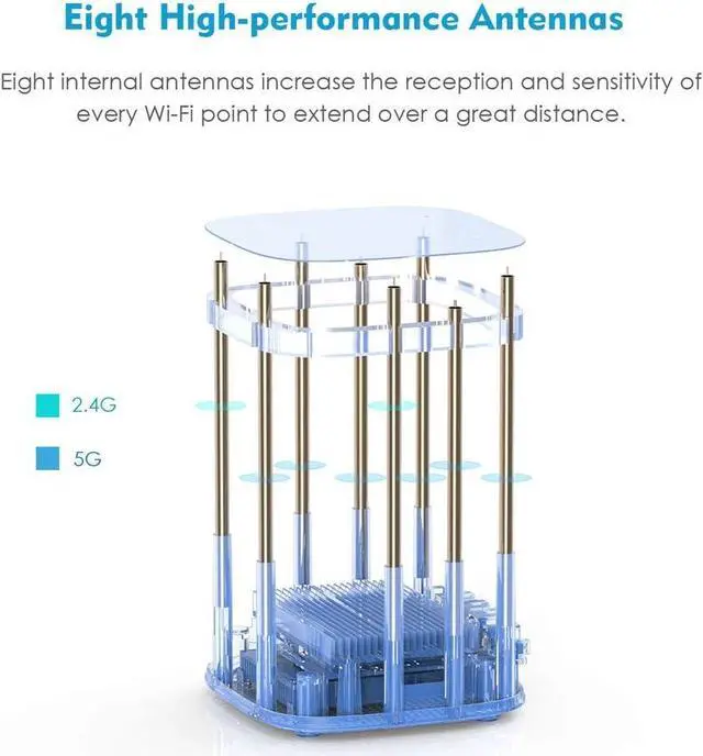 Patented omni-directional antennas: 4 x 7dBi 5G antennas + 2 x 5dBi 5G antennas + 2 x 5dBi 2.4G antennas, strengthening the WiFi coverage.