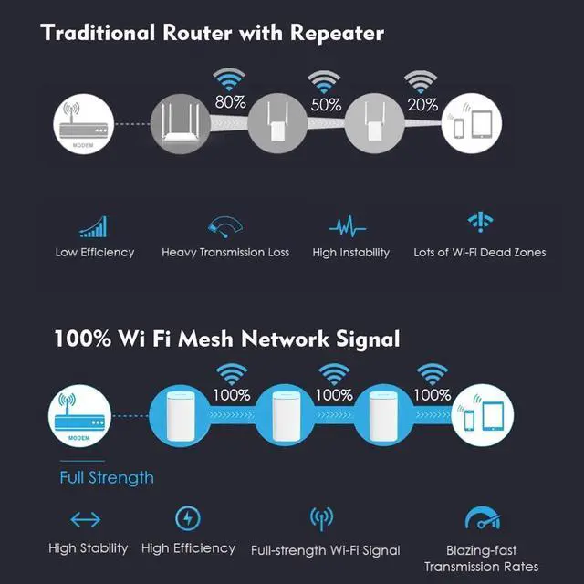 - With various WiFi technologies combined in one system, AC3000 whole home mesh expands the signal coverage more extensively ensuring that no more dead zones will be found again.
