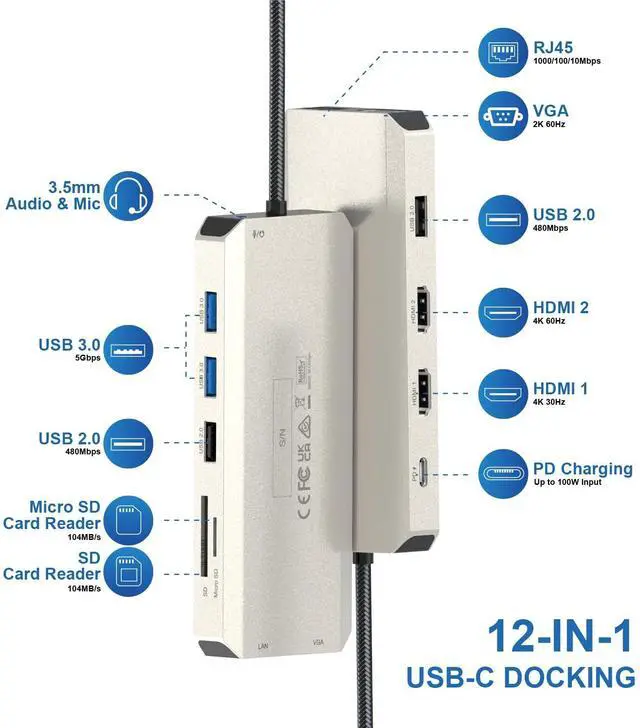 USB C Laptop Docking Station with Dual HDMI for Windows/ Linux/ Mac Laptops