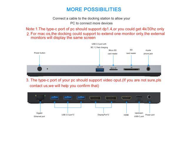 - 13 in 1 Docking Station - USB-C PD charging port, Gigabit RJ45 Port, 2 x 4K DP ports, HDMI port, SD/TF Card Reader, 4 x super speed USB 3.0 ports(Up to 5Gbps) for one port with fast charging, 4-Pole Phone Jack. Plug and play, no driver needs.