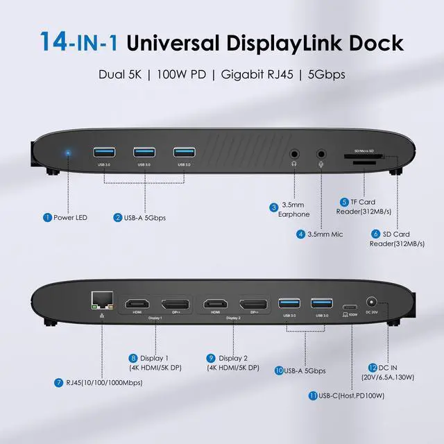 Side 2: 1 x RJ45(10/100/1000Mbps); Display 1 (HDMI/DP++); Display 2 (HDMI/DP++); 2x USB-A 5Gbps; 1x USB-C Upstream (Host, PD100W); 1x DC IN (20V)