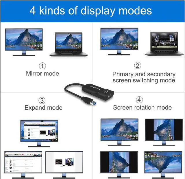 6. Accompany with a driver CD (Also can download it from our website) 7. Accompany with an extra USB 3.0 cable. Monitor Compatibility Supports Display
