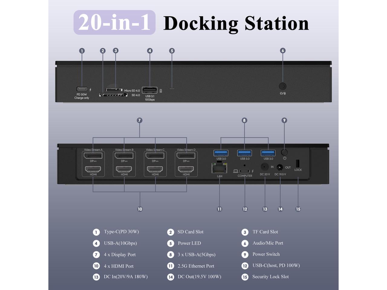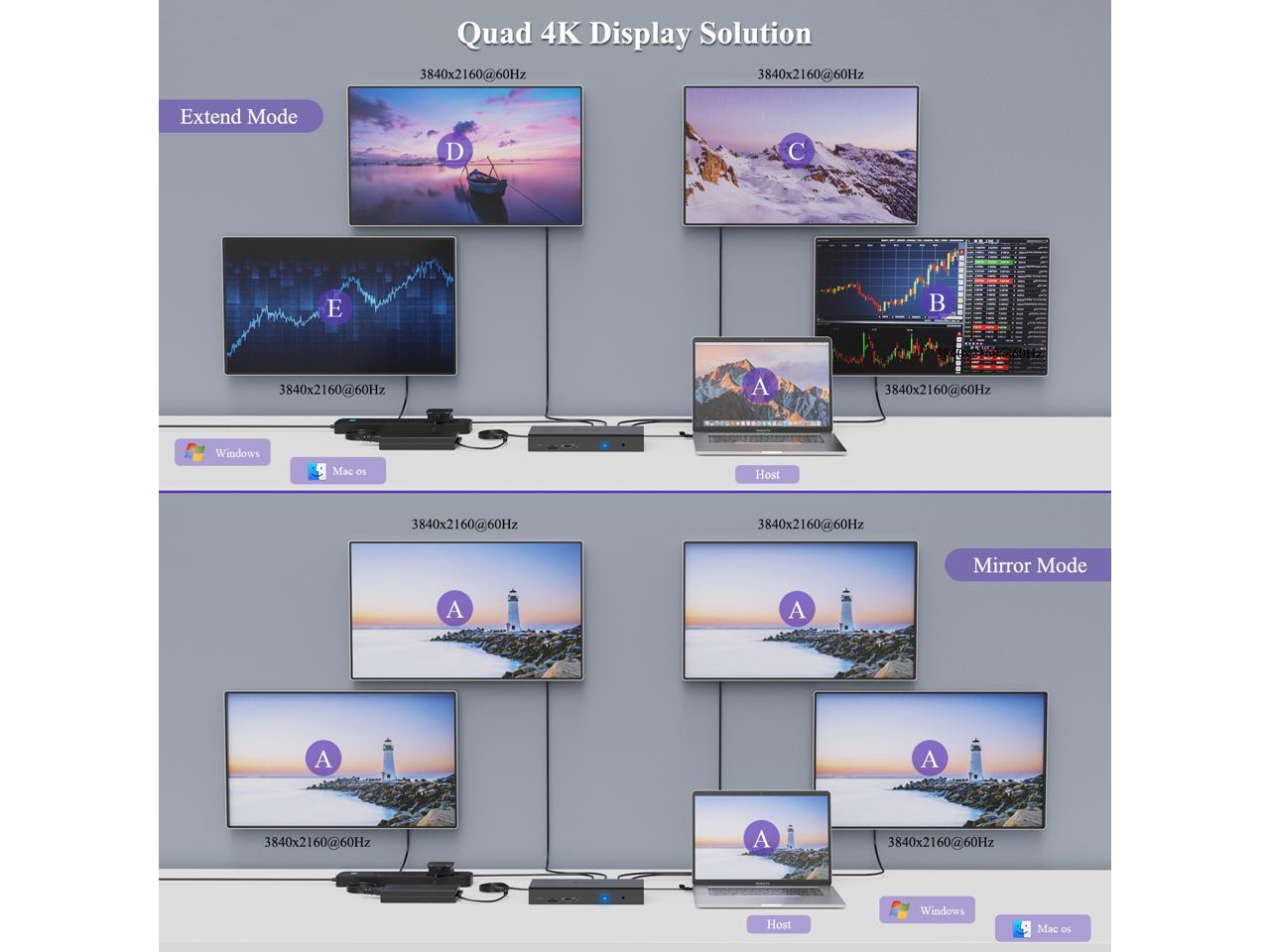 - Quadruple Monitor Support: The maximum resolution will be 5120x1440p60 (5K UItrawide) or 4096x2160p60 (Cinema 4K) if quad DisplayPort video outputs for quad monitors. Quad Display (HDMI/HDMI+DisplayPort ) resolution up to 3840x2160@60Hz or 4096x2160@60Hz (Cinema 4K). This docking station provides an immersive visual experience that is perfect for professional multitasking or entertainment purposes.Connection Way: DP/HDMI(Video Stream A)+ DP/HDMI(Video Stream B)+ DP/HDMI(Video Stream C)+DP/HDMI(Video Stream D)
