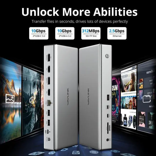 UG75PD1-DH2 is the first blockbuster product released by WAVLINK team, this docking station is a powerful 15 in 1 tool that can expand your work-from-home laptop's capabilities, reduce wire clutter, and leave your chargers behind! With the UG75PD1-DH2, youre not just adding screens, youre also getting a whole host of extra ports. Starting with the innovative display array, you can add up to single 10K at 60Hz dual 8K displays at 60Hz or four 4K displays at 60Hz in the configuration of dual HDMI and duan DP to USB4 / Thunderbolt 3/4/5 hosts.