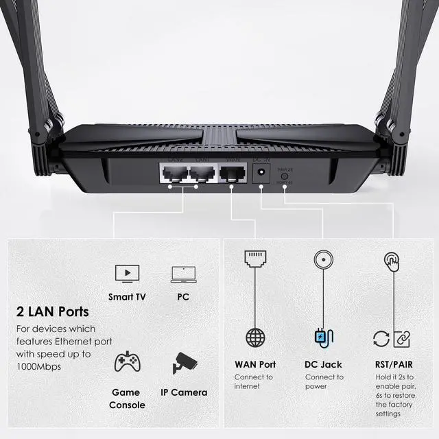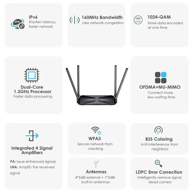 - Supports 160MHz bandwidth and 1024-QAM for much faster wireless connections.