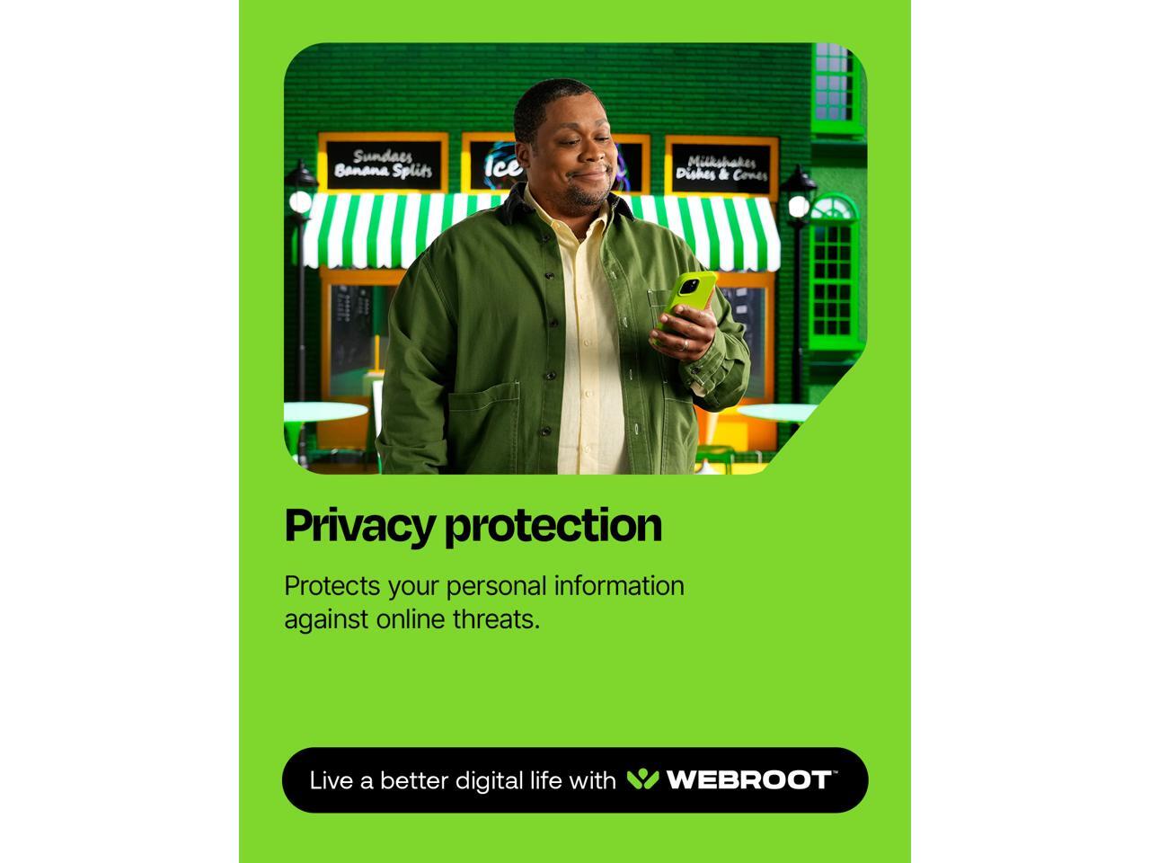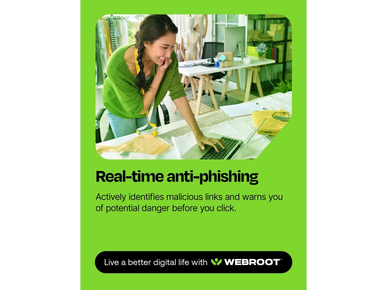 - Anti-phishing and privacy protection: Webroot protects your personal information against keyloggers, spyware, and other online threats and warns you of potential danger before you click.