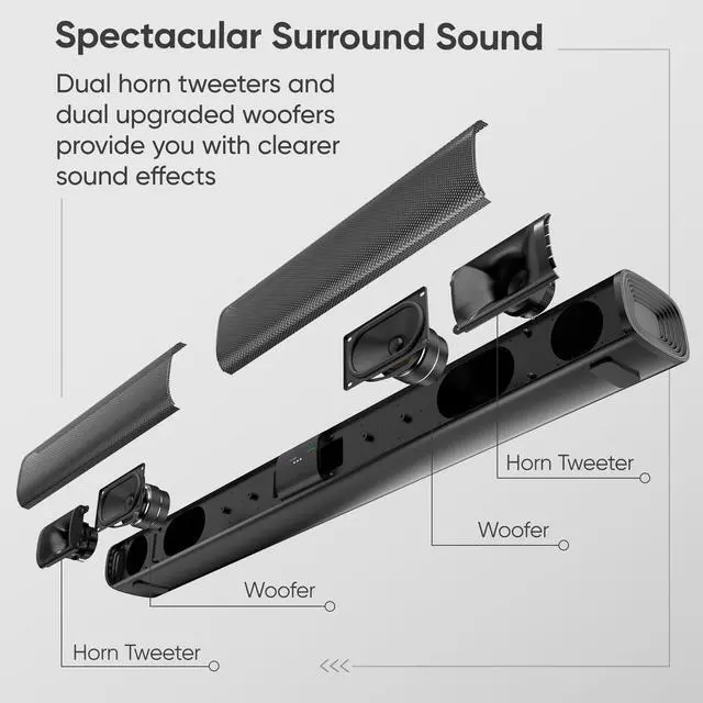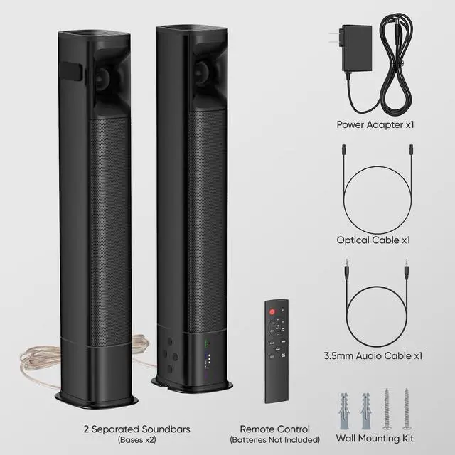Please note that this speaker features a two-in-one design. It can function as a single soundbar, or you can separate it into two individual tower speakers.