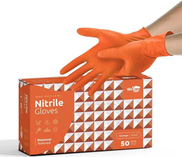 WeCare Nitrile Gloves 8 Mil - Heavy Duty Gloves with Diamond Texture Grip - Powder and Latex Free Disposable Gloves - Small - 50 Count - Orange