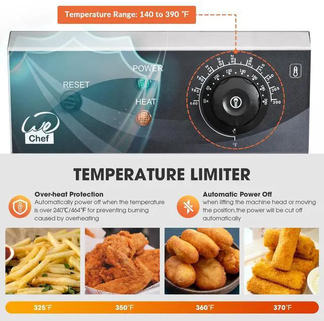 - 0.8mm thick commercial-grade stainless steel construction including machine, tank, lid & heating tube, ensures good resistance to rust, corrosion & ease of cleaning; Equipped with a temperature limiter for overheat protection, it will cut off the power automatically if temperature reaches 464°F for protecting machine & operational safety