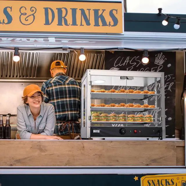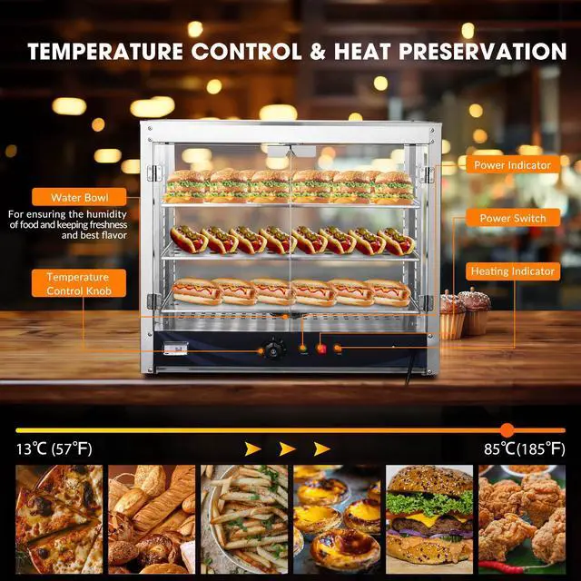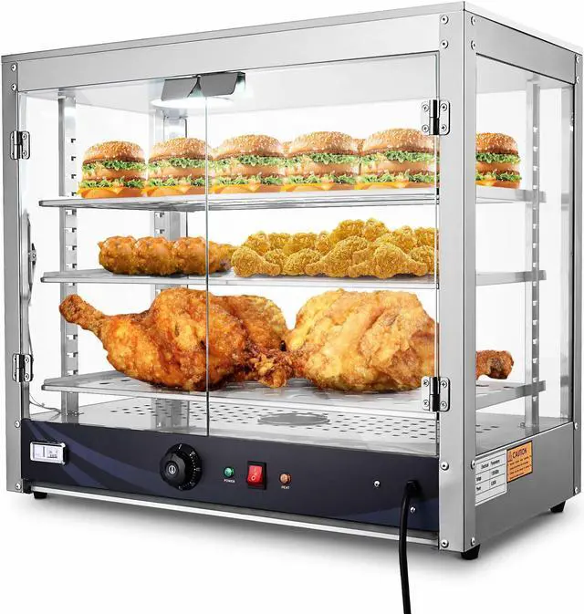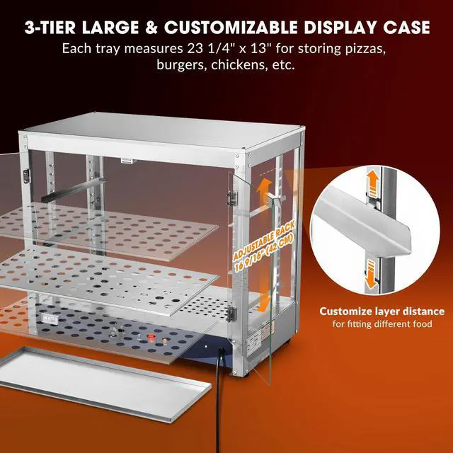 - Large & Customizable Display Case - 27"x15"x24" 800W 3-Tier Commercial Food Warmer features a large size with length up to 27" to provide spacious space for warming two 10-inch pizzas on each layer, ideal for using on large countertop in restaurants, buffets, bakeries, dessert shops and other commercial caterings, while the wide-open double doors for easy accessing to the food and 3 removable shelves for adjusting the layer distance to fit food of different sizes, such as pizzas, burgers, fried chickens and egg tarts