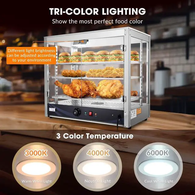 - Bright Illumination - Features a top LED bulb with 3 color temperatures including warm(3000K), natural(4000K) and cool white(6000K), illuminating the display case and making your food look fresh, lustrous and eye-catching, along with a high-definition glass for displaying the food clearly in every direction, perfect for attracting your customersttention