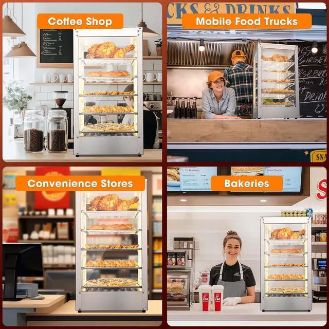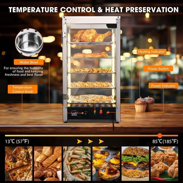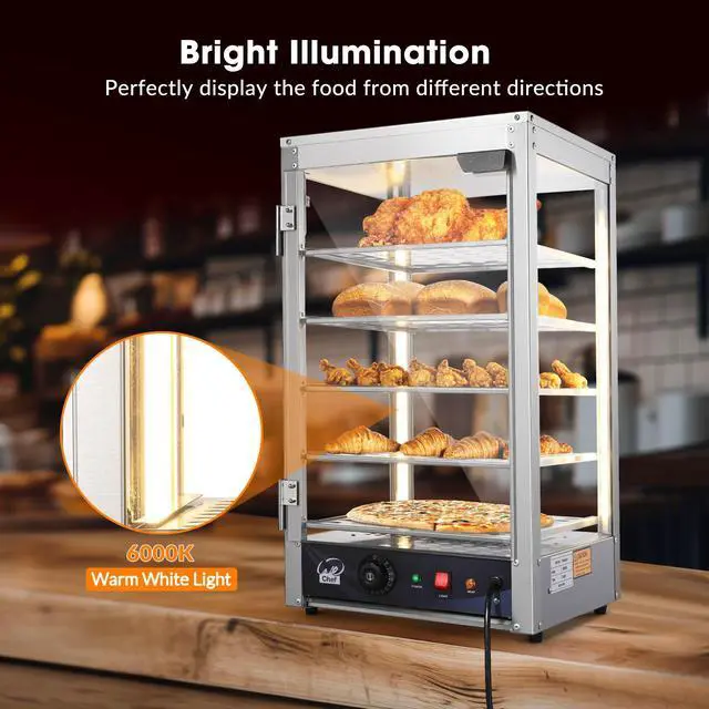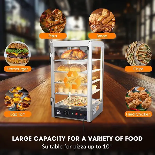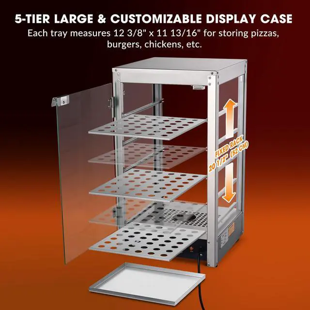 - Large 5-Tier Display Case - 600W 5-Tier Commercial Food Warmer features a size of 15"x15"x28" and 5 shelves for providing a 5-tier higher storage space which warms pizza up to 11" on each tier, ideal for displaying different food in one case and saving countertop space in cafes, convenience stores and other commercial places