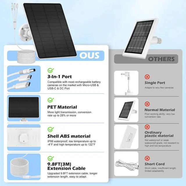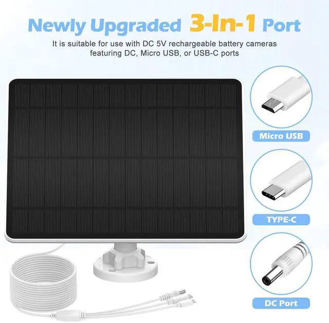 Our camera solar panel come with a 10FT long fast charging cable that allows you to easily connect your camera