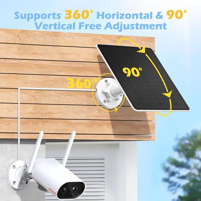 This solar panel security camera outdoor comes with 360°horizontal rotation and 90°vertical angle free adjustment to ensure maximum access to sunlight