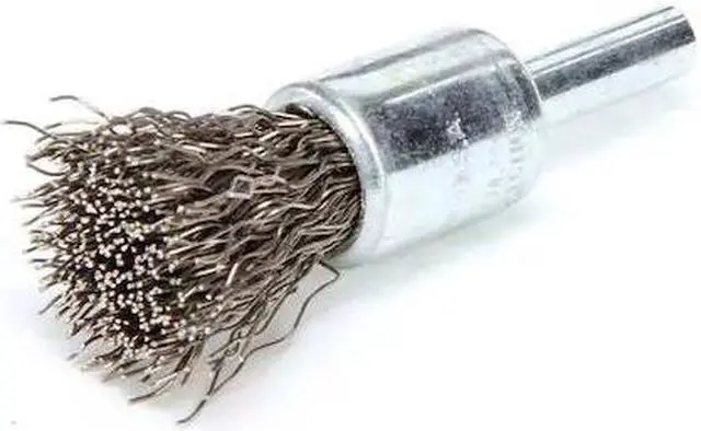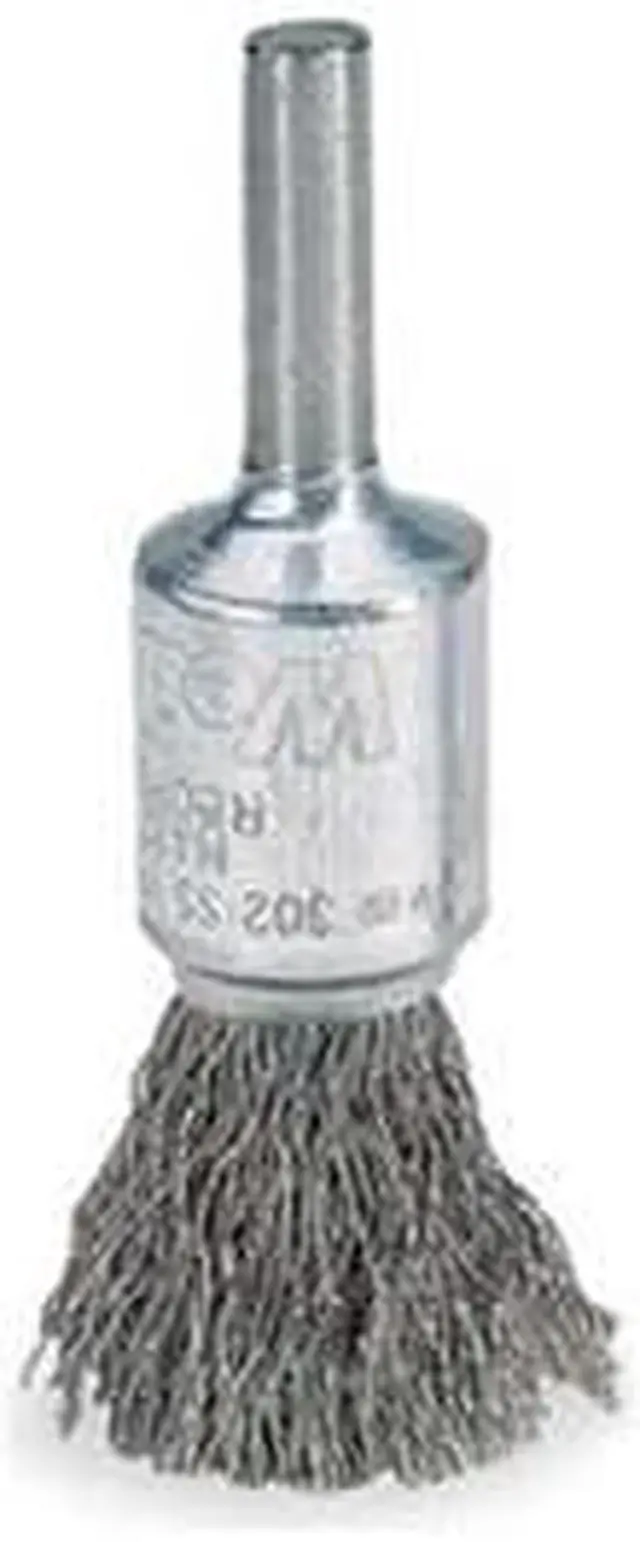 End Brush, Product Type End Brush, Quick Change System Not Applicable, Bristle Type Crimped Wire, Bristle Material Stainless Steel, Brush Dia. 1/2 in, Wire Dia. 0.014 in, Bristle Length 7/8 in, Grit Not Applicable, Overall Length 2 1/2 in, Compatible Tool Type Straight Grinder, Drill, Impact Driver, Pencil Grinder, Color Silver, Primary Material Application Stainless Steel, Connector Type Round Shank, Connector Size 1/4 in, Operating Speed - Maximum 25, 000 RPM, Shank Length 5/8 in