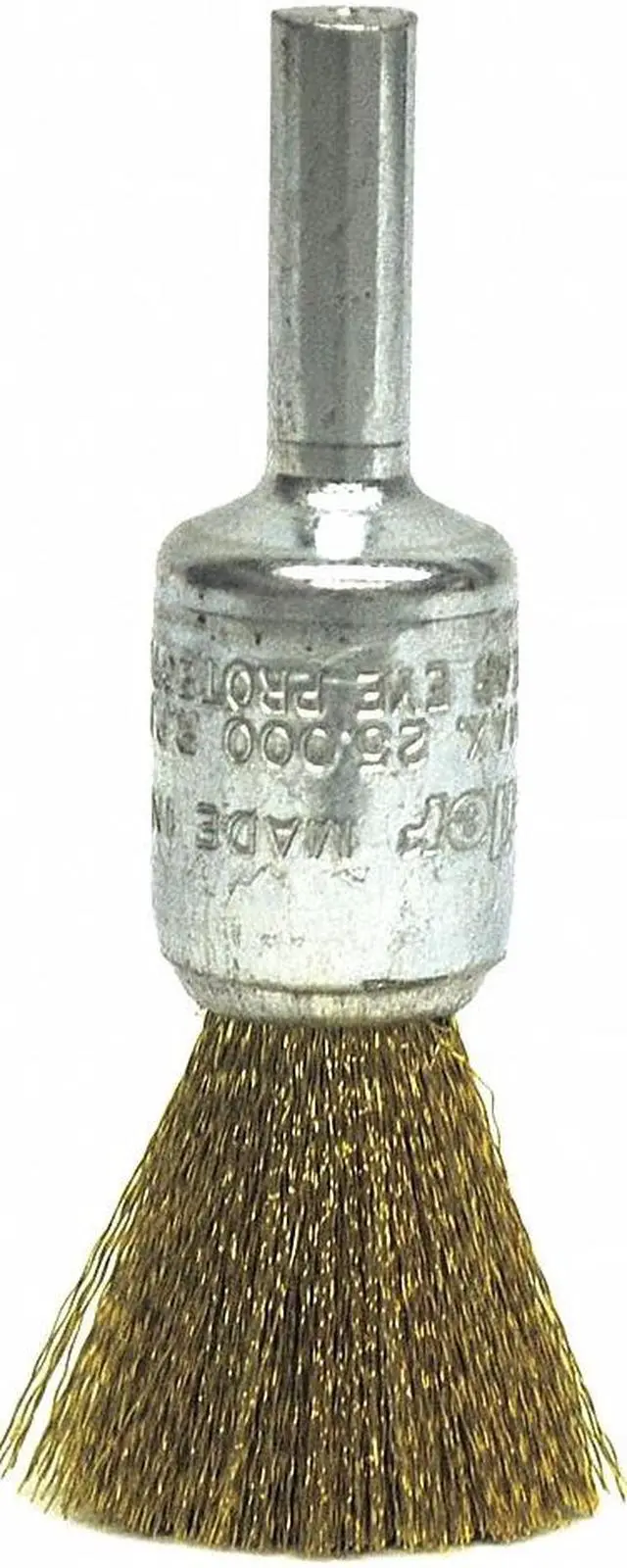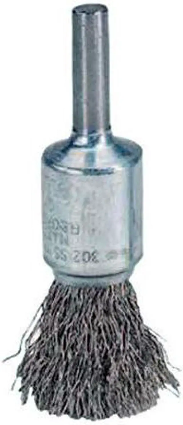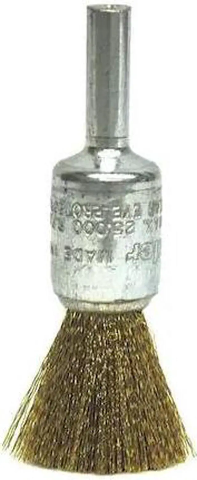 End Brush, Product Type End Brush, Quick Change System Not Applicable, Bristle Type Crimped Wire, Bristle Material Brass, Brush Dia. 1/2 in, Wire Dia. 0.005 in, Bristle Length 7/8 in, Grit Not Applicable, Overall Length 2 1/2 in, Compatible Tool Type Straight Grinder, Drill, Impact Driver, Pencil Grinder, Color Silver, Primary Material Application Brass, Connector Type Round Shank, Connector Size 1/4 in, Operating Speed - Maximum 25, 000 RPM, Shank Length 5/8 in. This item has been restricted from sale in the following state (s): []