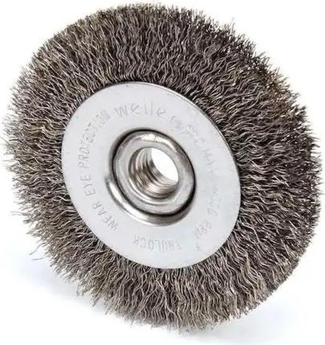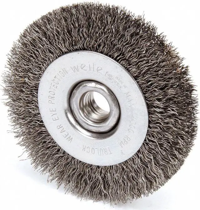 Wire Wheel Brush, Bristle Type Crimped Wire, Product Type Wire Wheel Brush, Bristle Material Carbon Steel, Brush Dia. 4 in, Grit Not Applicable, Face Width 1/2 in, Bristle Diameter 0.014 in, Bristle Length 7/8 in, Compatible Tool Type Angle Grinder, Primary Material Application Carbon Steel, Connector Type Threaded Hole, Connector Size 5/8 In. -11, Operating Speed - Maximum 20, 000 RPM, Shank Length Not Applicable, Color Not Applicable. This item has been restricted from sale in the following state (s): []
