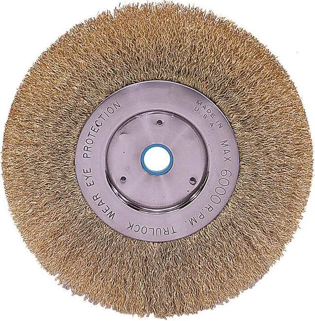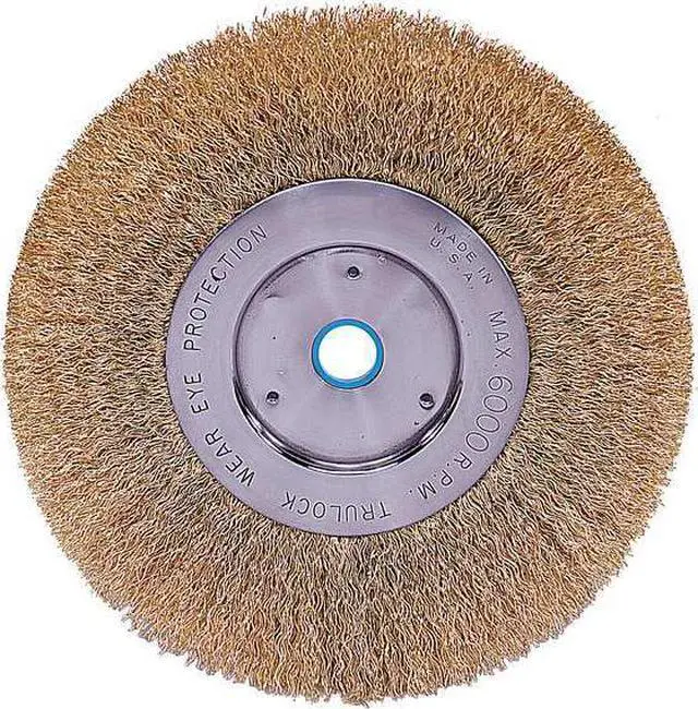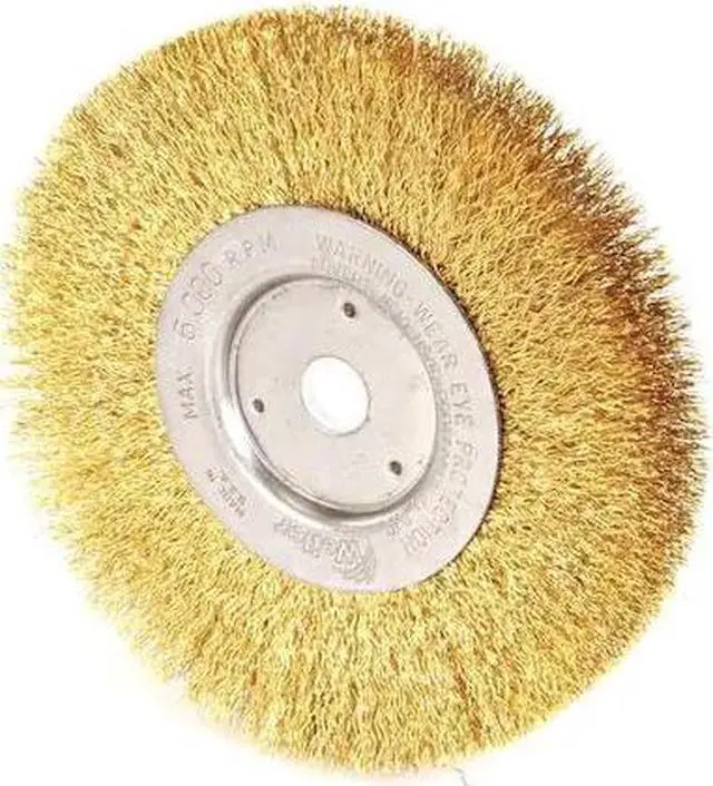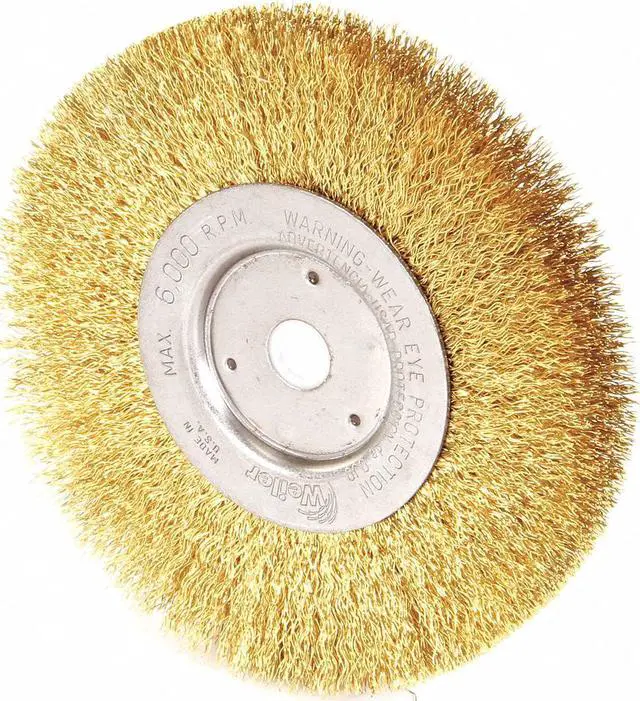 Wire Wheel Brush, Bristle Type Crimped Wire, Product Type Wire Wheel Brush, Bristle Material Brass, Brush Dia. 6 in, Grit Not Applicable, Face Width 1/2 in, Bristle Diameter 0.012 in, Bristle Length 1 7/16 in, Compatible Tool Type Bench Grinder, Primary Material Application Brass, Connector Type Threaded Hole, Connector Size 5/8 in to 1/2 in, Operating Speed - Maximum 6, 000 RPM, Shank Length Not Applicable, Color Not Applicable. This item has been restricted from sale in the following state (s): []