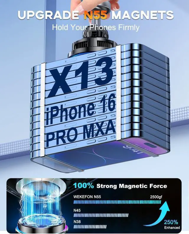 Upgraded N55 Super Magnets Our magnetic wireless car charger mounts feature premium N55 magnets with 2500g clamping force 250% stronger than the standard in the market! No more phone slipping or falling, even on bumpy roads, steep slopes, or sudden brakes.