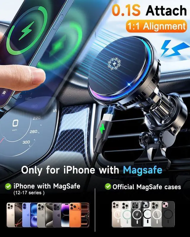Our is 2026 Upgraded TEC and Fan Dual Cooling Magnetic Wireless Car Charger, For 15W Magsafe Car Charger Mount, RGB, Air Vent/Dashboard Fast Wireless Charging Car Phone Holder for iPhone 17/16/15/14/13/12.