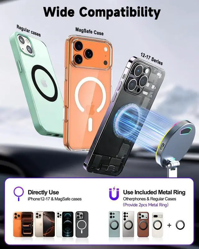 for iPhone 17 Air, iPhone 17 Pro,iPhone 17 Pro Max, iPhone 17,iPhone 17 Plus,iPhone 16e , iPhone 16 Pro,iPhone 16 Pro Max, iPhone 16,iPhone 16 Plus,iPhone 15 Pro IPhone 15 Pro Max, iPhone 15,iPhone 14 pro max, iPhone 14 plus, iPhone 14, iPhone 14 pro, iPhone 14 mini, iphone 13, 13 mini, 13 Pro, 13 Pro Max, iPhone 12 mini, 12, 12 pro, 12 pro max and Samsung Galaxy s26 s25 Ultra Plus 24 series, Pixel with MagSafe Cases, Or for Samsung galaxy S25 S24 S23 Note 20 10 etc other smartphones that support wireless charging use with our magnetic ring(provide 2pcs)