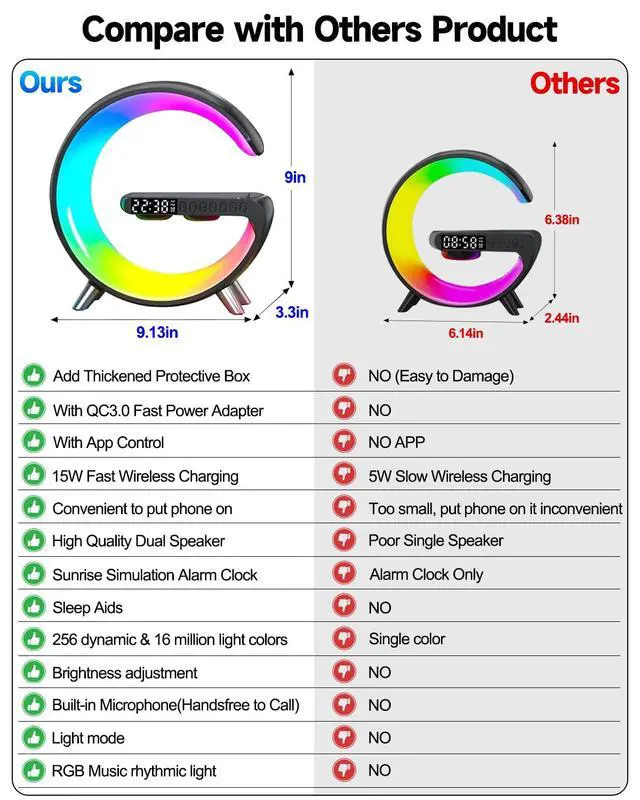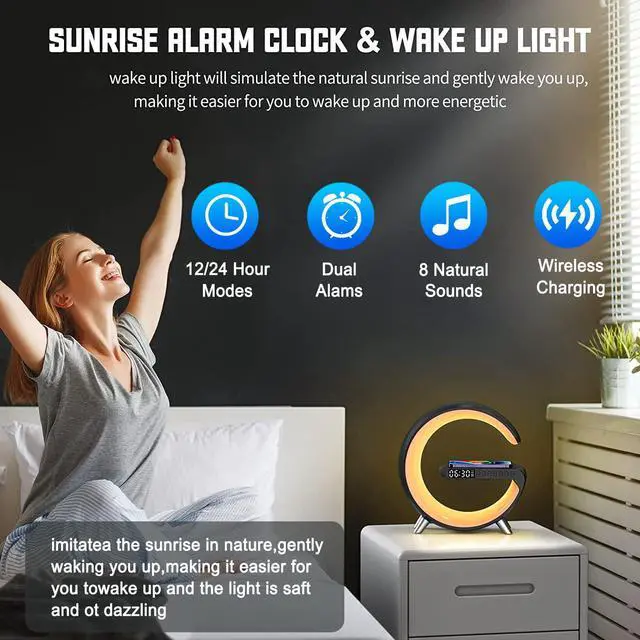 5-in-1 Multifunctional G LightLarger Size Our Larger Size:3.3"D x 9.13"W x 9"H(8.38 cm x 23.19cm x 22.86cm). This original light all-in-one device combines an ambient atmosphere light, a powerful Bluetooth speaker, Sunrise alarm clock, Night Light and 15W Fast Wireless charging. It serves as a versatile bedside companion for your bedroom, office, or desktop, enhancing your environment during work, study, relaxation, or home Decor etc.