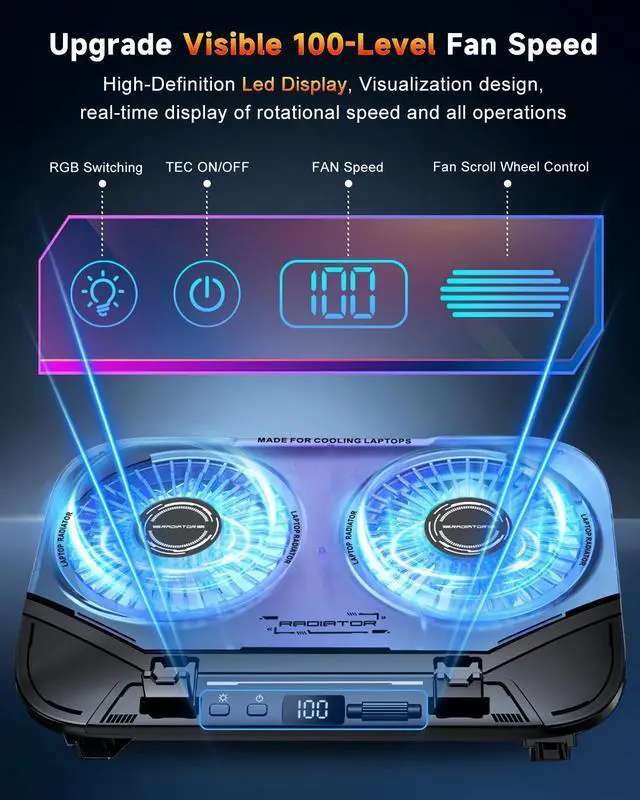 2026 Upgraded Laptop Cooling Pad with Dual TEC Cooler, Gaming Laptop Cooler with 2 Powerful Turbo Larger Fans, Fast Cooling Laptop for 12-21 inch Computer, 5 Height Adjustable Stands, 100 Gear Speed Adjust, LCD Screen, 10-RGB and Foldable Phone Holder, Follow were the main features of our new laptop cooling pad: