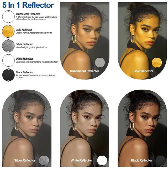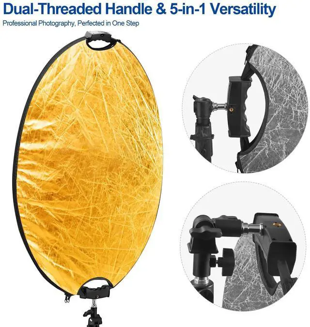 WELLMAKING 32''(80cm) Photography Reflector Dual Handle Collapsible 5-in-1 with Tilt Adapter Reflector, White Portable Stand and Pouch for Studio & Outdoor Lighting-Translucent,Silver,Gold,White&Black