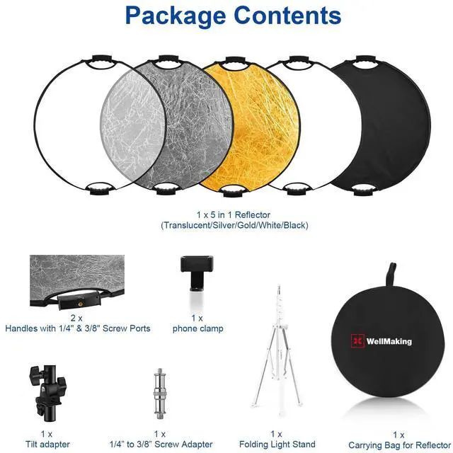 - [EASY TO CARRY AND READY TO SHOOT]: the reflector folds down to just 12 inches and comes with a carrying case; the light stand is small, sturdy and stable, with adjustable leg angles and a folded height of 18.3 inches / 465 mm. Whether you are a travelling photographer capturing the beauty of the world, or a photography enthusiast on a daily trip, the kit is easy to take with you and start creating at any time.