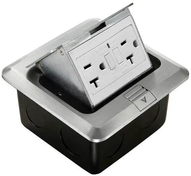 A pop up outlet box is hidden in your countertop or floor when closed, all you see is a stylish stainless steel top. When you push the button the top tilts open revealing the GFCI outlet.