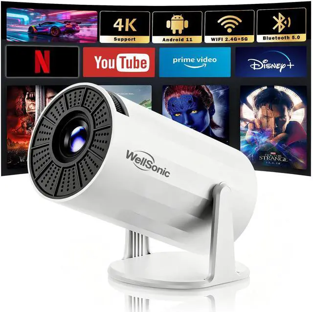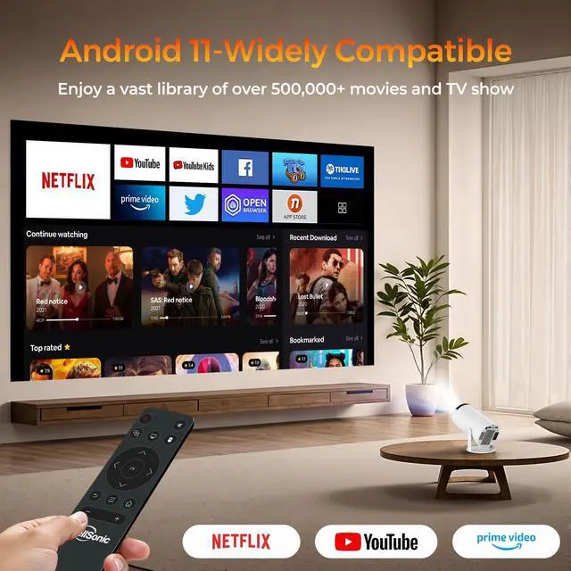 Smart projector with built-in Apps: This mini smart projector is powered by Android 11 and a high-performance H713 chip, giving you direct access to Netflix, Prime Video, YouTube, and other popular platformsno extra streaming device required. Enjoy over 1,000,000 movies and TV shows anytime, anywhere