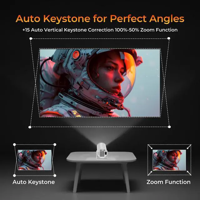 Perfect picture in seconds: This home projector get the ideal view every time with auto keystone correction to instantly straighten the image, manual focus for razor-sharp clarity, and a 180° rotating design that lets you project onto walls, ceilings, or any you want surface