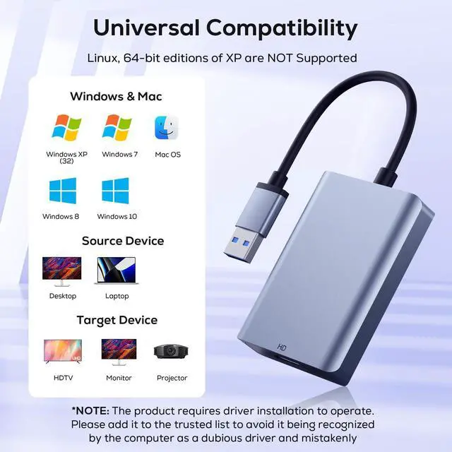 This USB to HDMI adapter connects USB 3.0/2.0 PCs/laptops to HDTVs via HDMI, enabling seamless photo/video streaming for immersive big-screen viewing.