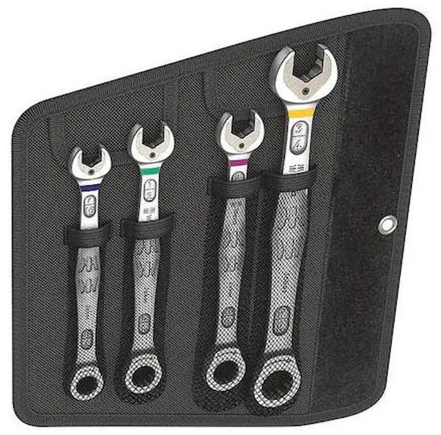 Combination Wrench Set, Alloy Steel, Nickel Chrome, Number of Tools 4, Range of Head Sizes 7/16 in to 3/4 in, Head Offset Angle 0 Degrees, Standard, Pouch, SAE, 7/16 in, 1/2 in, 9/16 in, 3/4 in, Hex, Opening Angle (Deg. ) 0 Degrees