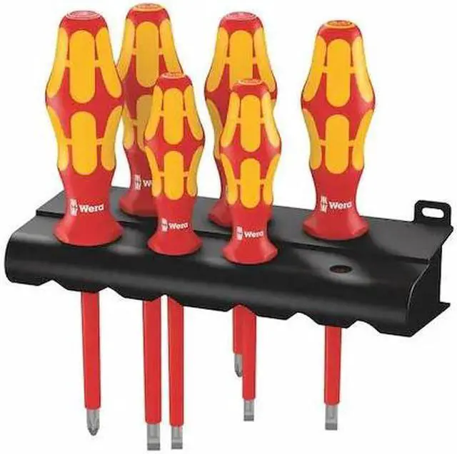 Insulated Screwdriver Set, Tip Finish Chrome, 3/32 in, 5/32 in, 7/32 in, 9/64 in, Phillips, Slotted, Ergonomic, Number of Pieces 6, Yes, ESD Safe No, Non-Sparking No, Measurement Type SAE, Includes Keystone Slotted 3/32 in x 3 in, 9/64 in x 4 in, 5/32 in x 4 in, 7/32 in x 5 in, Phillips #1 x 3 in, #2 x 4 in, Tether Ready No, Range of Shank Lengths 3 in to 5 in. This item has been restricted from sale in the following state (s): []