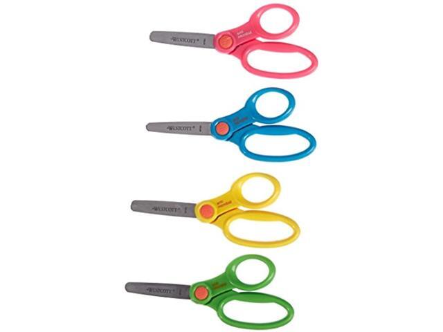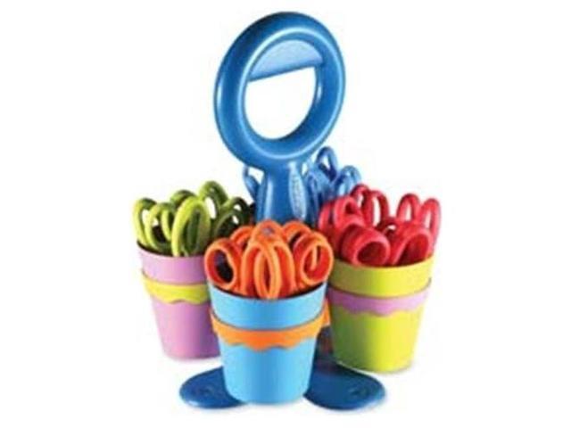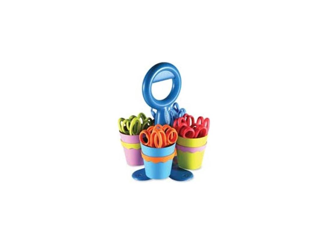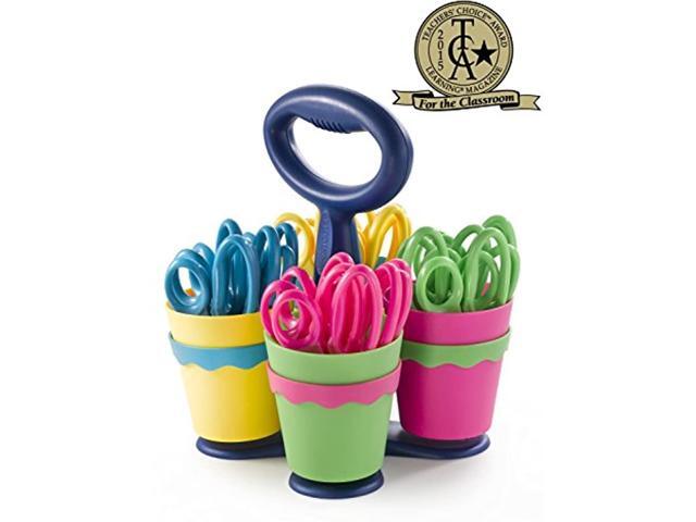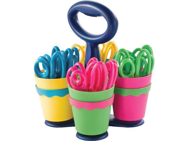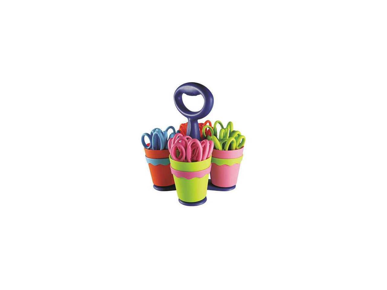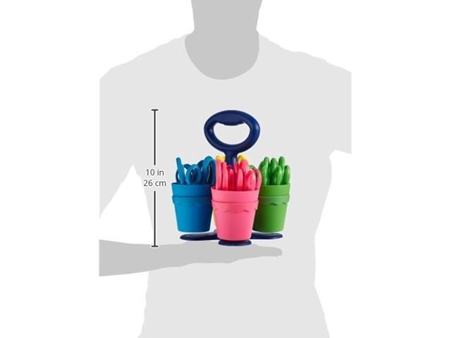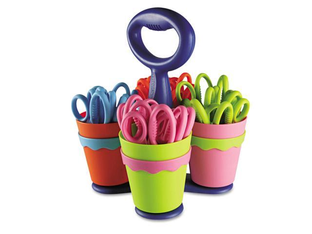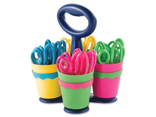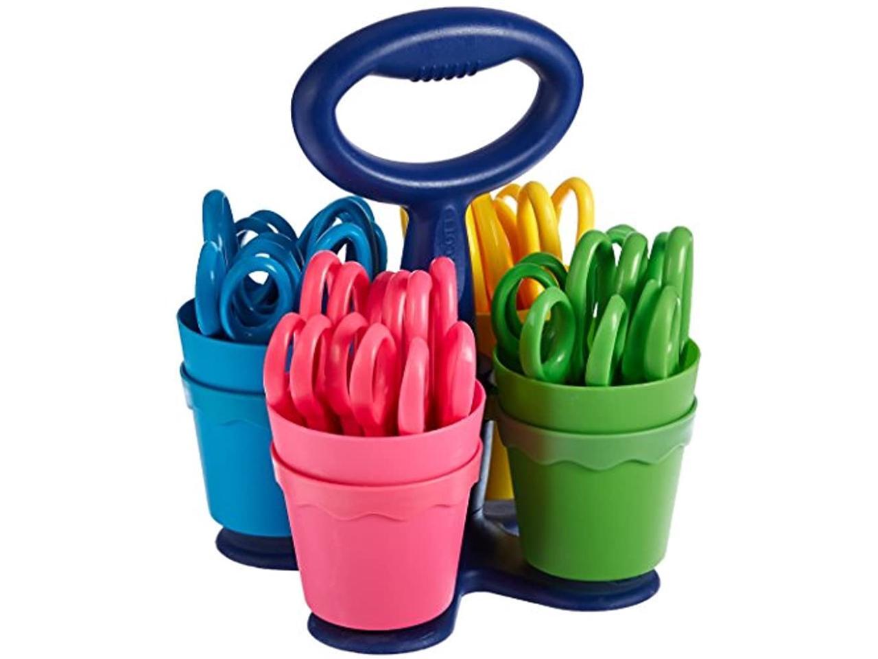 Convenient classroom-size caddy. Scissors have plastic handles and safety blades.